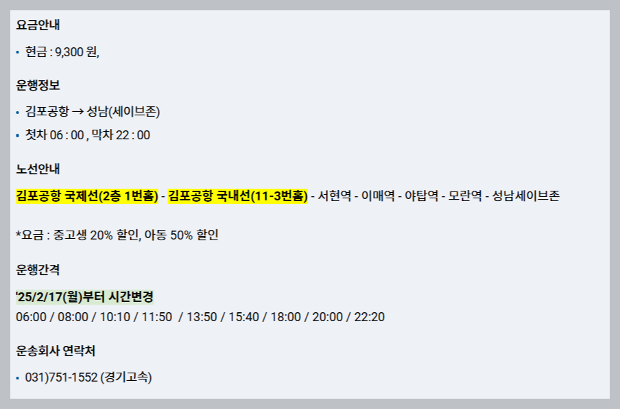 🕓김포공항→성남행 리무진 버스시간