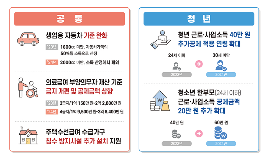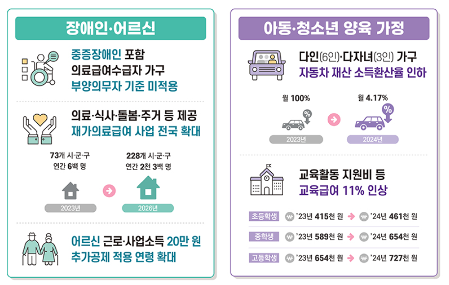 청년 근로소득 공제 확대, 자동차재산 기준 완화 등 제도 개선을 통해 복지 사각지대를 줄이고, 더 많은 국민이 기초생활보장 혜택을 누릴 수 있습니다.