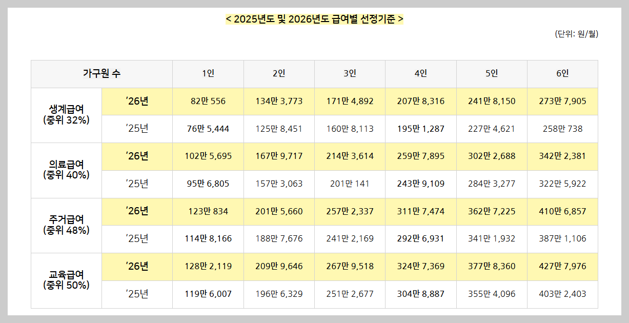 2026년 기준 중위소득 인상과 생계급여, 의료급여, 주거급여, 교육급여 기준 변경은 저소득층과 취약계층의 생활 안정에 큰 도움이 됩니다.