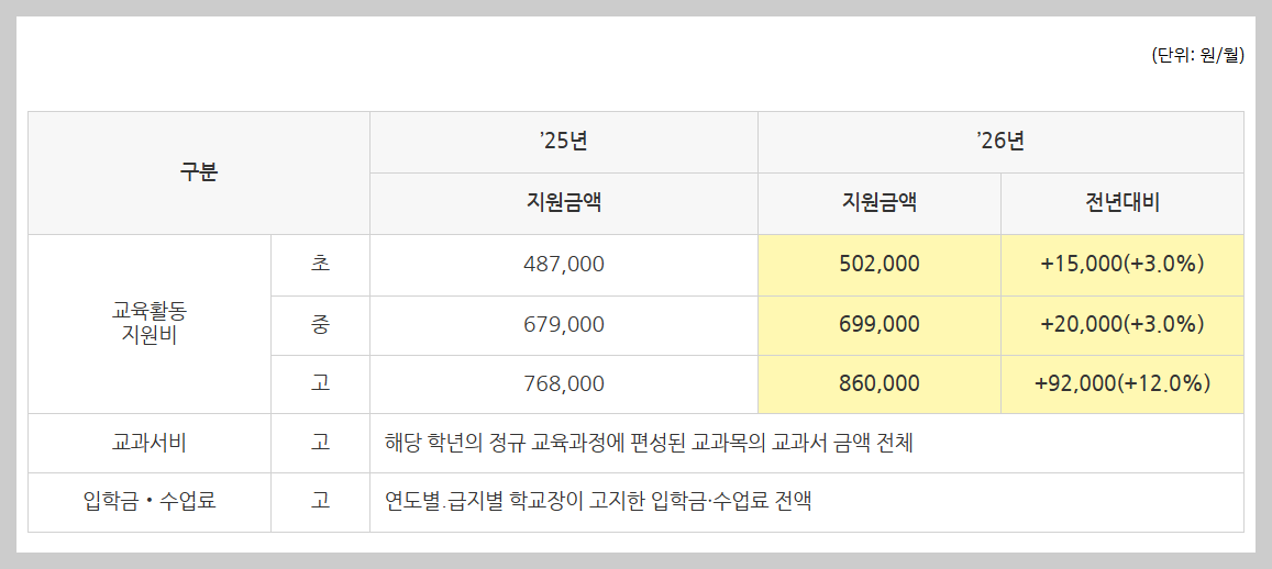 2026년 교육활동지원비는 초등 50만 2,000원, 중등 69만 9,000원, 고등 86만 원으로 평균 6% 인상되었습니다.