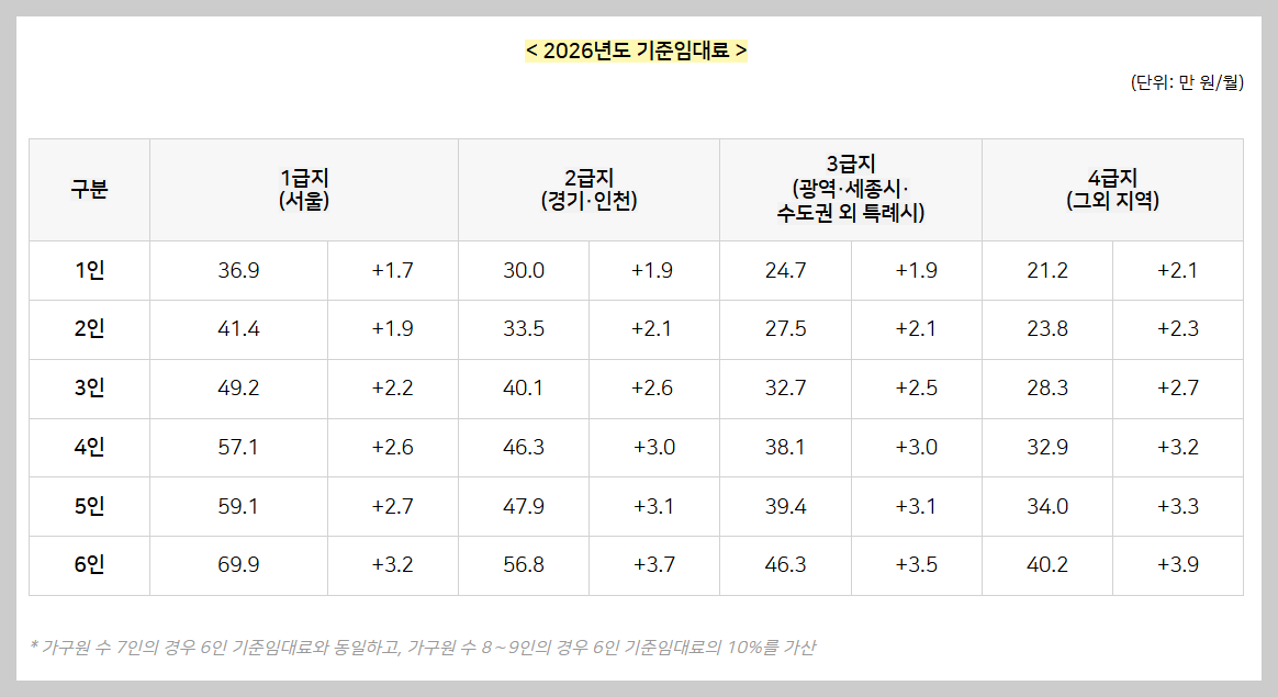 2026년 임차가구 기준 임대료는 지역·가구원 수별로 1.7만~3.9만 원 인상되었습니다. 서울 4인 가구 기준 월 57만 1,000원이 지원되며, 주거안정성 강화 효과가 기대됩니다.