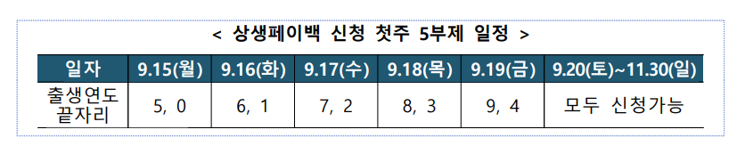 상생페이백 신청 첫 주인 9월 15일(월)부터 9월 19일(금)까지는 원활한 신청을 위해 출생연도 끝자리 숫자에 따른 5부제가 운영되었습니다.