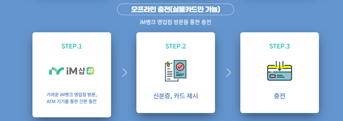 iM뱅크 영업점을 방문 → 신분증 및 카드 지참 → 직원 안내에 따라 충전 진행